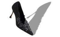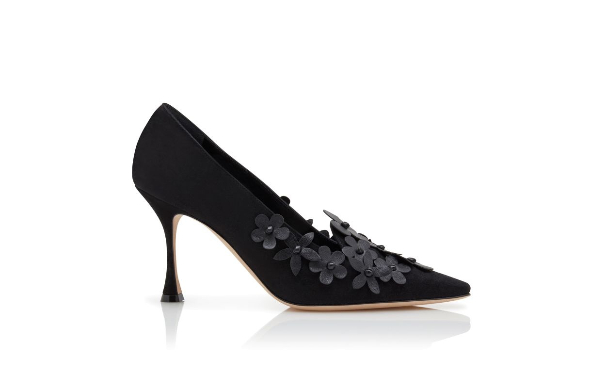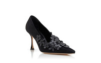 Black suede pointed toe pumps featuring decorative nappa leather tonal flowers and stiletto high heel. Upper: 80% kid suede, 20% lamb nappa. Sole: 100% calf leather. Lining: 100% kid leather. Heel measures 90 mm. Italian sizing. Made in Italy. Product ID: 225-1764-0001