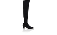 Black suede thigh high boots featuring fitted, slip on design with low block heel. Upper: 100% kid suede. Sole: 100% cow leather. Lining: 100% goat skin. Heel measures 50mm. Italian sizing. Made in Italy. Product ID: 322-2306-0002