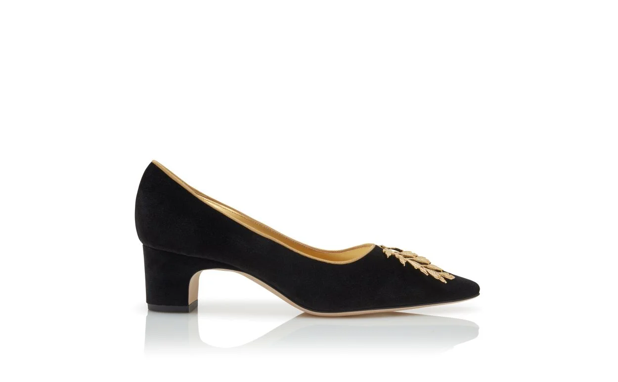 Black velvet almond toe pumps featuring decorative gold leaf embellishment and grosgrain edging. Finished with a low block heel. Upper:100% polyester.Sole:100% calf leather.Lining:100% kid leather.Heel measures:50 mm.Italian sizing. Made in Italy. Product ID: 425-2242-0001
