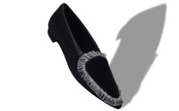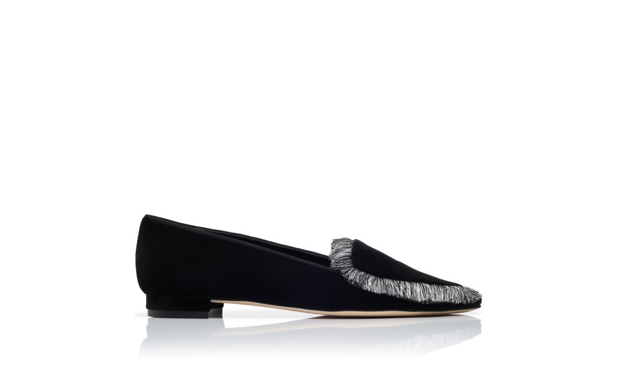 Black velvet round toe loafers featuring white fringing details and flat stacked heel. Upper:100% velvet.Sole:100% calf leather.Lining:100% kid leather.Heel measures:10 mm.Italian sizing. Made in Italy. Product ID: 325-3065-0002