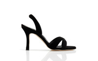 Black velvet open toe slingback sandals featuring crossover straps and stiletto high heel. Upper: 100% velvet. Sole: 100% calf leather. Lining: 100% kid leather. Heel measures 90 mm. Italian sizing. Made in Italy. Product ID: 324-2985-0002