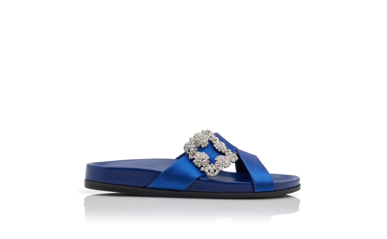 Blue satin open toe flat mules featuring crossover straps with decorative clear crystal jewel buckle. Finished with flat rubber sole. Upper: 72% viscose, 28% silk. Sole: 100% rubber. Lining: 100% kid leather. Heel measures 10 mm. Italian sizing. Made in Italy. Product ID: 123-2425-0008