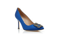 Blue satin almond toe pumps featuring a square crystal buckle encased in a gunmetal frame. Finished with a stiletto high heel. Upper: 68% viscose, 32% silk. Sole: 100% cow leather. Lining: 100% goat skin. Heel measures 90mm. Italian sizing. Made in Italy. Product ID: 9XX-0663-0048