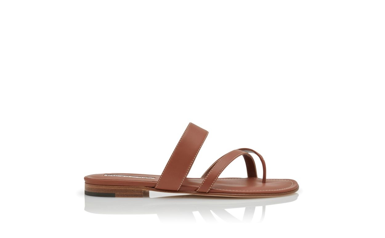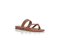 Brown calf leather open toe flat sandals featuring crossover straps with contrast stitching and flat stacked heel. Upper: 100% calf leather. Sole: 100% calf leather. Lining: 100% kid leather. Heel measures 10mm. Italian sizing. Made in Italy. Product ID: 120-1350-0003
