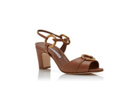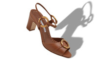 Brown calf leather open toe sandals featuring gold circular details, slingback design and ankle strap closure. Finished with block mid heel. Upper: 100% calf leather. Sole: 100% calf leather. Lining: 100% kid leather. Heel measures 70 mm. Italian sizing. Made in Italy. Product ID: 225-1822-0001