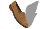 Brown calf suede loafers featuring apron cut design and flat stacked heel. Upper: 100% calf suede. Sole: 100% calf leather. Lining: 100% kid leather. Heel measures 10 mm. Italian sizing. Made in Italy. Product ID: 225-1881-0004