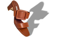 Brown nappa leather open toe mules featuring decorative buckle detail and finished with mid block heel. Upper: 100% lamb nappa. Sole: 100% calf leather. Lining: 100% kid leather. Heel measures 50mm. Italian sizing. Made in Italy. Product ID: 121-1767-0005