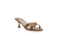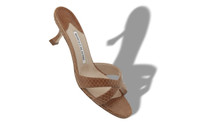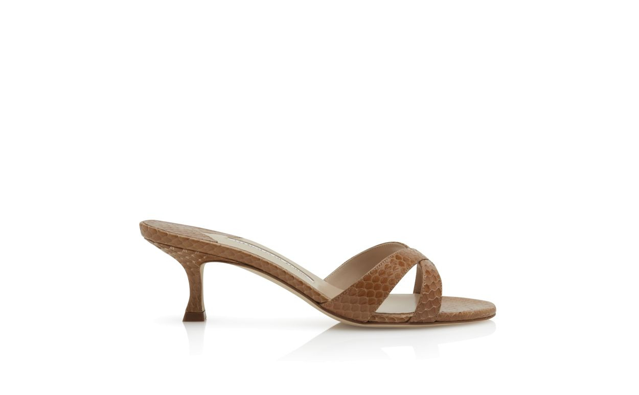 Brown snakeskin open toe mules featuring textured crossover straps and kitten heel. Upper: 100% snakeskin. Sole: 100% cow leather. Lining: 100% goat skin. Heel measures 50mm. Italian Sizing. Made in Italy. Product ID: 120-1243-0009