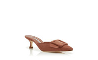 Brown suede pointed toe mules featuring decorative buckle detail and stiletto low heel. Upper: 100% kid suede. Sole: 100% calf leather. Lining: 100% kid leather. Heel measures 50 mm. Italian sizing. Made in Italy. Product ID: 9XX-0246-0145