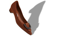 Brown suede pointed toe pumps featuring circular buckle and block high heel. Upper:100% kid suede.Sole:100% calf leather.Lining:100% kid leather.Heel measures:105 mm. Italian sizing. Made in Italy. Product ID: 325-3021-0001