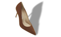 Brown suede pointed toe court shoes with a stiletto high heel. Upper: 100% kid suede. Sole: 100% cow leather. Lining: 100% goat skin. Heel measures 90mm. Made in Italy. Product ID: 9XX-0416-0012