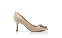 Champagne satin almond toe pumps featuring a square crystal buckle encased in a gunmetal frame. Finished with a stiletto mid heel. Upper: 68% viscose, 32% silk. Sole: 100% cow leather. Lining: 100% kid leather. Heel measures 70mm. Italian sizing. Made in Italy. Product ID: 9XX-0662-0034