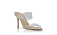Clear ECO PVC mules featuring open toe design, two front straps and beige suede stiletto high heel. Upper: 50% ECO PVC, 50% kid suede. Sole: 100% cow leather. Lining: 100% goat skin. Heel measures 90mm. Italian sizing. Made in Italy. Product ID: 219-0180-0001