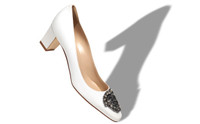 Cream crepe de chine almond toe pumps featuring a decorative crystal buckle and mid block heel. Upper: 100% silk. Sole: 100% calf leather. Lining: 100% kid leather. Heel measures 50mm. Italian sizing. Made in Italy. Product ID: 9XX-0574-0009