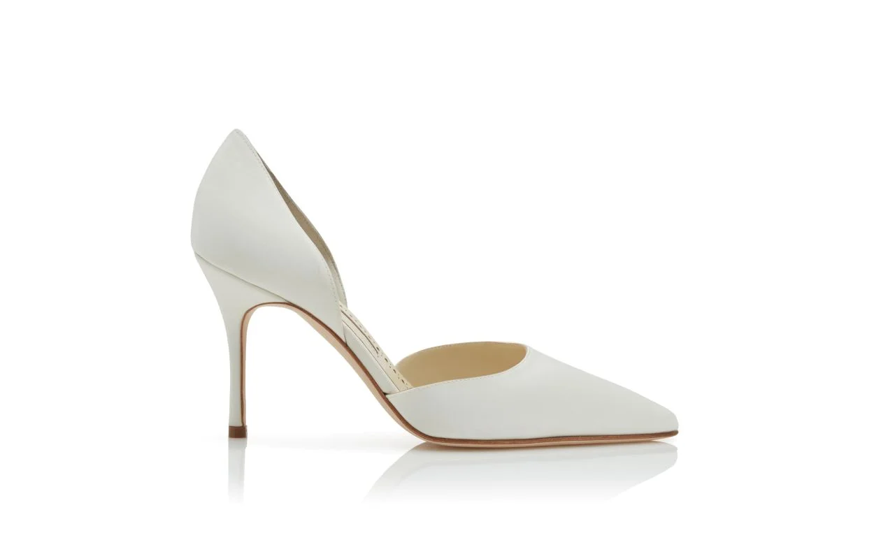 Cream satin pointed toe D'Orsay pumps featuring a stiletto high heel. Upper:50% fabric, 50% silk.Sole:100% calf leather.Lining:100% kid leather.Heel measures:90mm.Italian sizing. Made in Italy. Product ID: 425-2141-0001