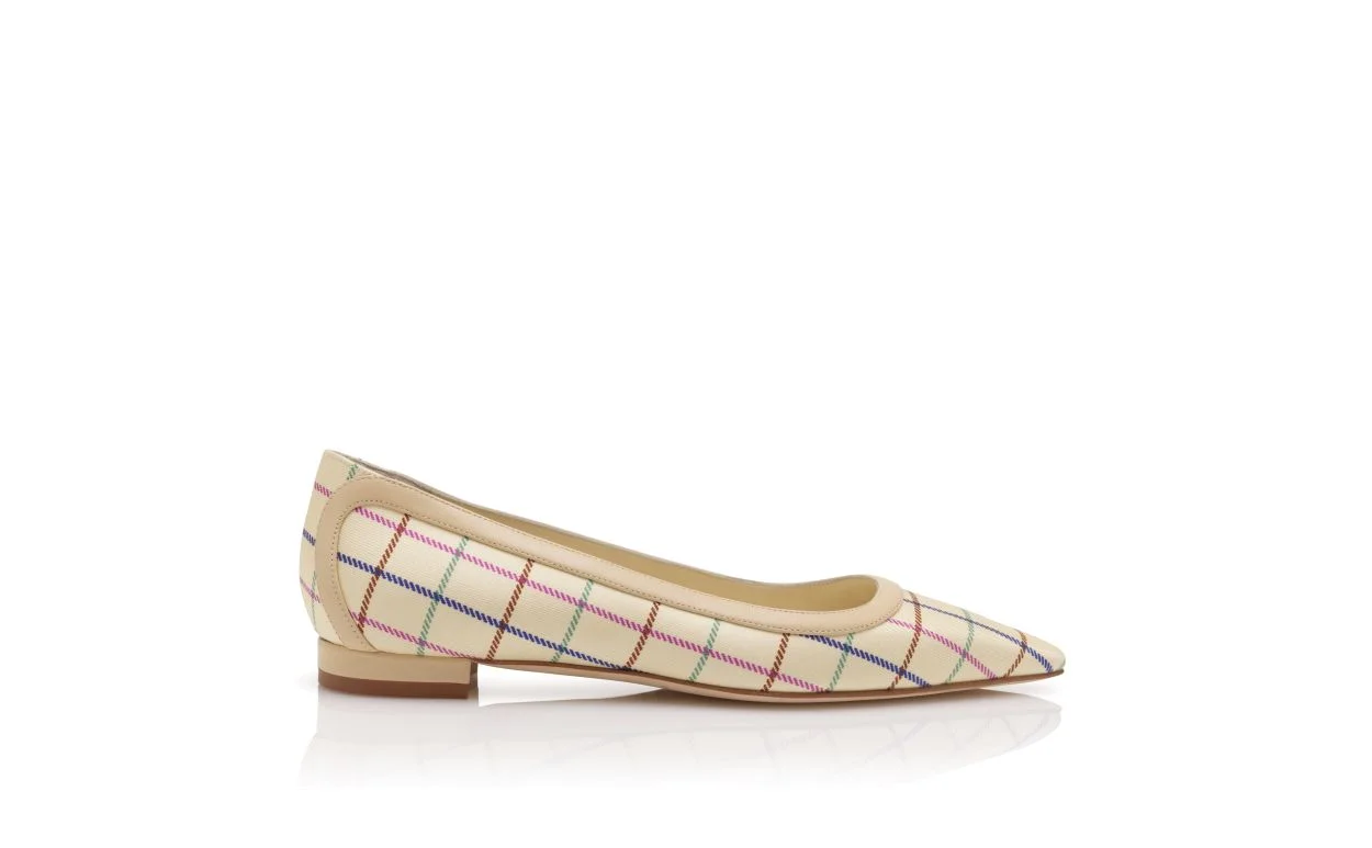 Cream silk almond toe pumps featuring multicoloured check design and light beige nappa leather edging. Finished with a flat stacked heel. Upper:97% silk, 3% lamb nappa.Sole:100% calf leather.Lining:100% kid leather.Heel measures:10 mm.Italian sizing. Made in Italy. Product ID: 126-3096-0001