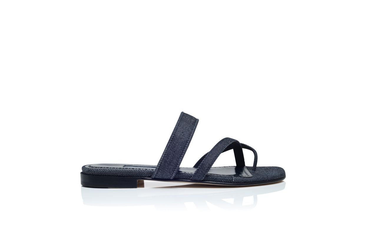 Dark blue chambray open toe flat sandals featuring crossover straps with toe stem, instep strap and flat stacked heel. Upper: 100% cotton. Sole: 100% calf leather. Lining: 100% kid leather. Heel measures 10 mm. Italian sizing. Made in Italy. Product ID: 225-1986-0001