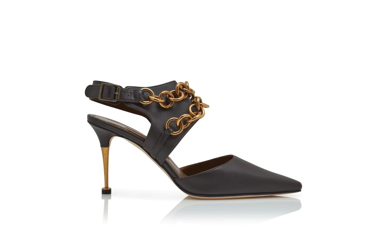 Dark brown calf leather almond toe pumps featuring cut-out design, decorative chain detailing and ankle strap with buckle closure. Finished with a stiletto high heel in a bronzed brass finish. Upper:100% calf leather.Sole:100% calf leather.Lining:100% kid leather.Heel measures:90 mm.Italian sizing. Made in Italy. Product ID: 425-2044-0001
