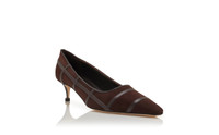 Dark brown suede almond toe pumps featuring tonal nappa leather crossover detailing and a stiletto low heel. Upper:85% kid suede, 15% lamb nappa.Sole:100% calf leather.Lining:100% kid leather.Heel measures:50 mm.Italian sizing. Made in Italy. Product ID: 425-2085-0004
