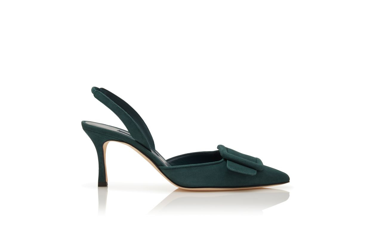 Dark green suede pointed toe pumps featuring elasticated slingback design, decorative buckle detail and stiletto mid heel. Upper:100% kid suede.Sole:100% calf leather.Lining:100% kid leather.Heel measures:70 mm. Italian sizing. Made in Italy. Product ID: 219-0182-0115