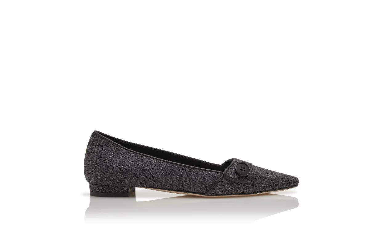 Dark grey almond toe pumps featuring fold over strap with button detail and nappa leather edging. Finished with a flat stacked heel. Upper:98% wool, 2% lamb nappa.Sole:100% calf leather.Lining:100% kid leather.Heel measures:10 mm.Italian sizing. Made in Italy. Product ID: 425-2116-0001