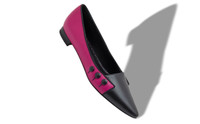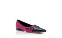 Dark pink nappa leather pointed toe flat pumps featuring black toe cap, edging and decorative buttonhole design with buttons. Finished with flat stacked heel. Upper: 100% lamb nappa. Sole: 100% calf leather. Lining: 100% kid leather. Heel measures 10 mm. Italian sizing. Made in Italy. Product ID: 225-1849-0001