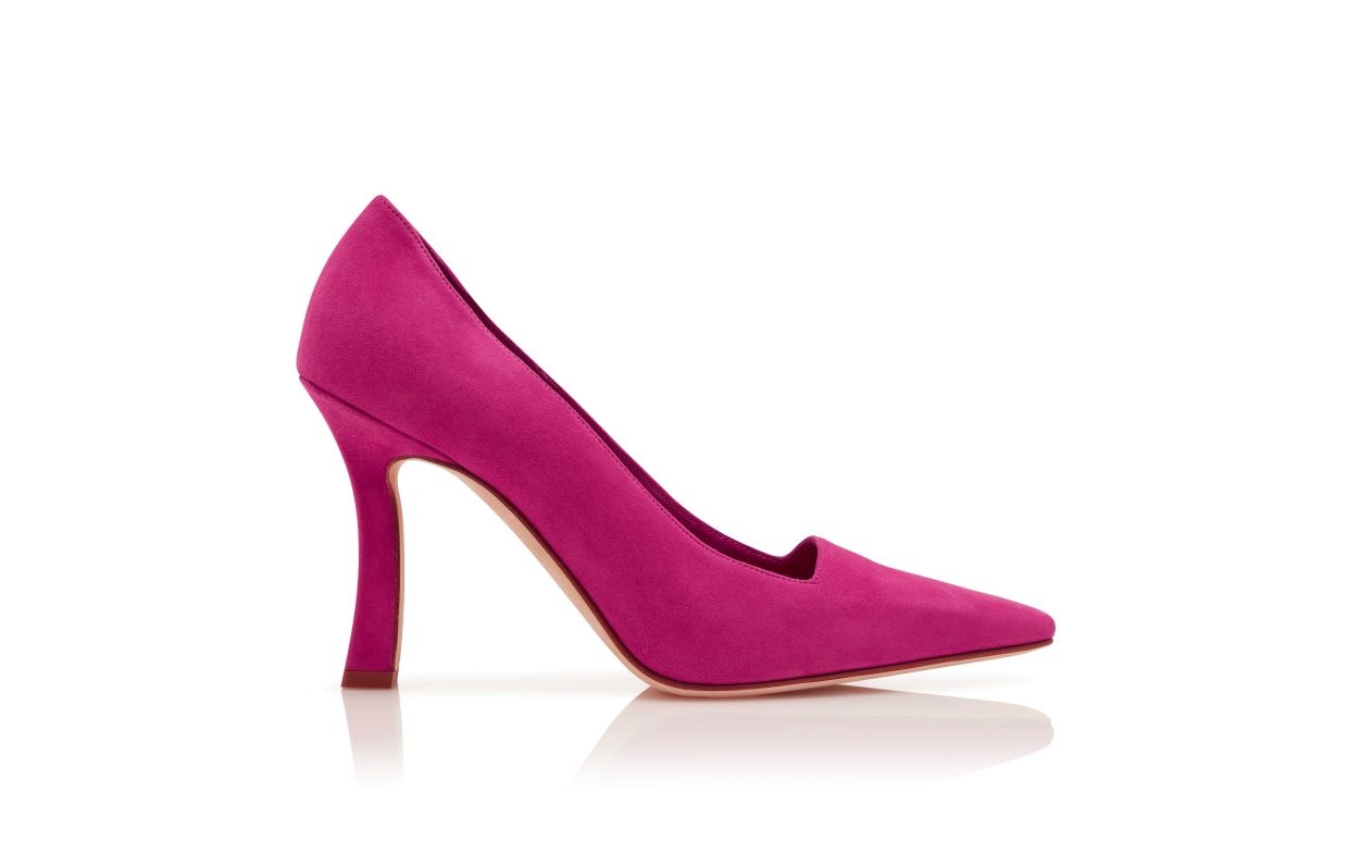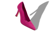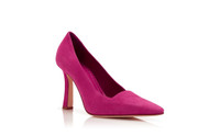 Dark pink suede pointed toe pumps featuring square cut design and flared block high heel. Upper: 100% kid suede. Sole: 100% calf leather. Lining: 100% kid leather. Heel measures 105 mm. Italian sizing. Made in Italy. Product ID: 225-1808-0002