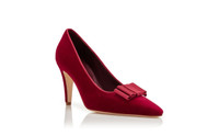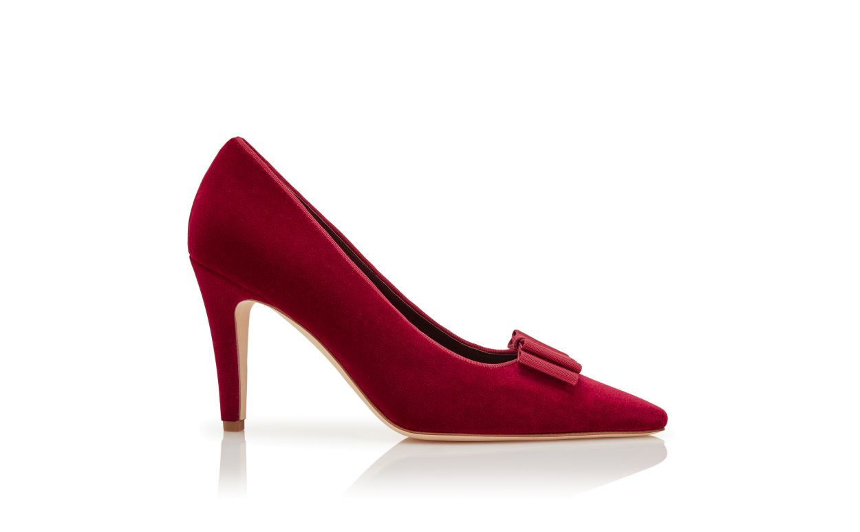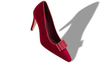 Dark red suede pointed toe pumps featuring red decorative bow detail, tonal grosgrain trim and stiletto high heel. Upper:100% velvet.Sole:100% calf leather.Lining:100% kid leather.Heel measures:90 mm. Italian sizing. Made in Italy. Product ID: 325-3131-0005