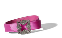 Fuchsia satin belt featuring a moveable square crystal buckle with a push stud fastening. Upper: 68% viscose, 32% silk. Lining: 100% nappa leather. Made in Italy. Product ID: 118-0131-0002