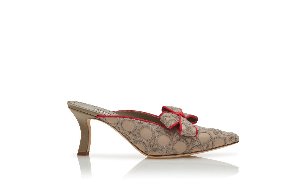 Grey silk pointed toe mules featuring circular embroidered design, decorative bow and red edging details. Finished with angular mid heel. Upper:100% fabric.Sole:100% calf leather.Lining:100% kid leather.Heel measures:70 mm. Italian sizing. Made in Italy. Product ID: 325-3026-0001