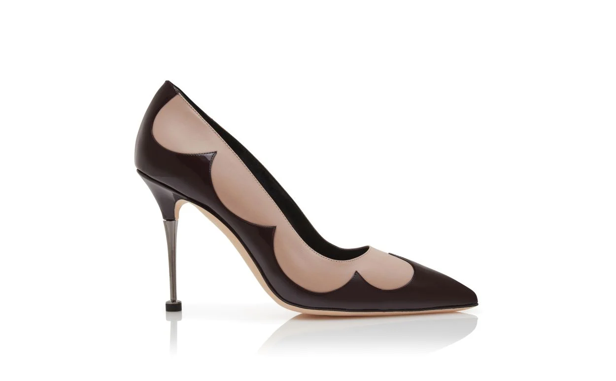 Dark brown patent leather pointed toe pumps featuring light beige nappa leather scalloped design. Finished with a stiletto high heel in a ruthenium finish. Upper:50% patent calf leather, 50% calf leather.Sole:100% calf leather.Lining:100% kid leather.Heel measures:105 mm.Italian sizing. Made in Italy. Product ID: 425-2058-0001