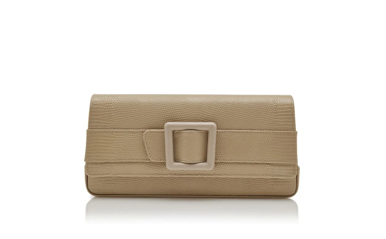 Light beige calf leather clutch bag featuring lizard print detailing, flap-over design with magnetic closure and decorative buckle. Contains internal compartment, mirror and removable chains with two length options. Upper:95% calf leather, 5% lamb nappa.Lining:72% viscose, 28% silk. Made in Italy.Height:12 cm.Length: 24 cm.Width: 6 cm.Straps measure 37 cm and 110 cm. Product ID: 425-2250-0004