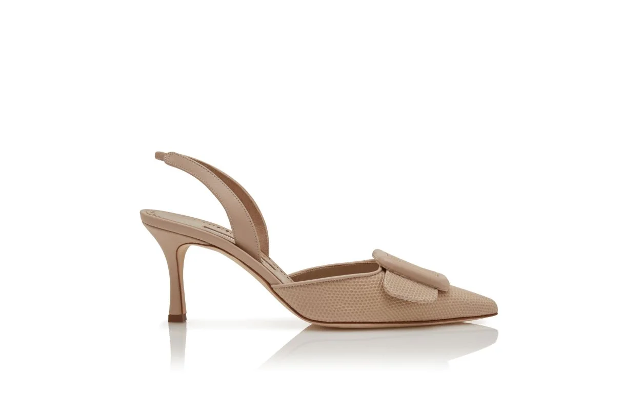 Light beige calf leather pointed toe pumps featuring lizard print detailing, decorative buckle and elasticated slingback strap. Finished with a stiletto mid heel. Upper:95% calf leather, 5% lamb nappa.Sole:100% calf leather.Lining:100% kid leather.Heel measures:70 mm.Italian sizing. Made in Italy. Product ID: 425-2139-0001