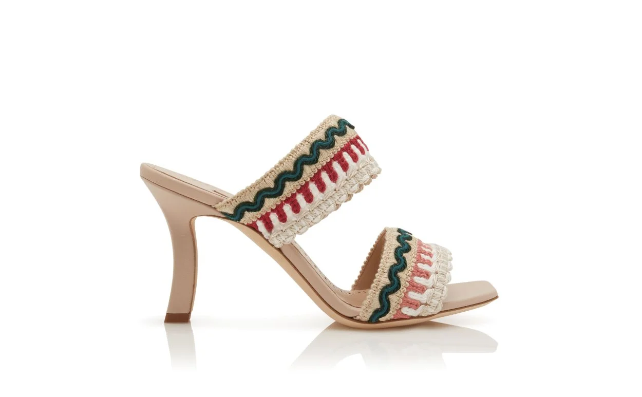 Light beige nappa leather open toe mules featuring two front straps with knitted ribbon detailing. Finished with an angular high heel. Upper:80% viscose, 20% acrylic.Sole:100% calf leather.Lining:100% kid leather.Heel measures:90 mm.Italian sizing. Made in Italy. Product ID: 425-2031-0004