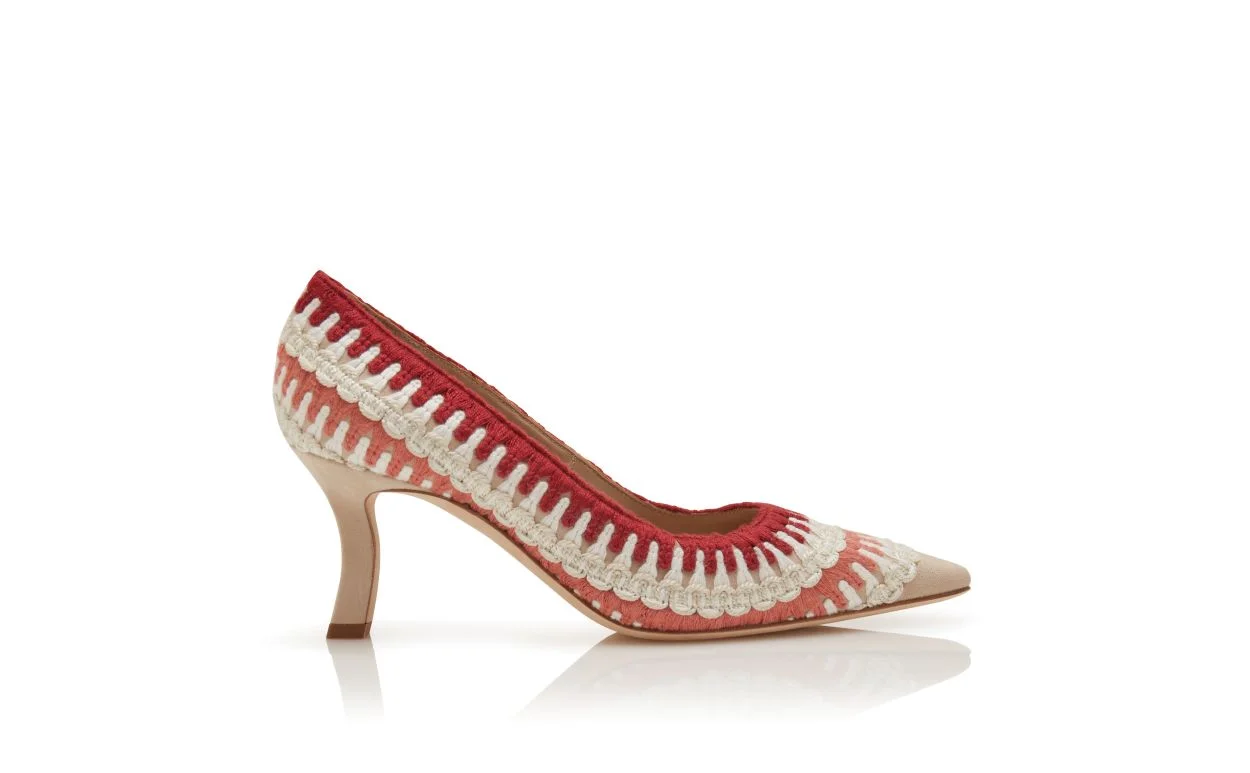 Light beige suede almond toe pumps featuring knitted ribbon detailing and an angular mid heel. Upper:50% kid suede, 50% fabric.Sole:100% calf leather.Lining:100% kid leather.Heel measures:70 mm.Italian sizing. Made in Italy. Product ID: 425-2036-0001