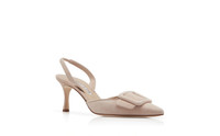 Light beige suede pumps featuring pointed toe, decorative buckle detail, elasticated slingback strap and stiletto mid heel. Upper: 100% kid suede. Sole: 100% cow leather. Lining: 100% goat skin. Heel measures 70mm. Italian sizing. Made in Italy. Product ID: 219-0182-0007