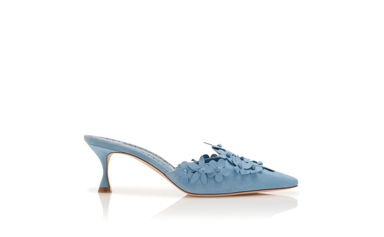 Light blue suede pointed toe pumps featuring decorative nappa leather tonal flowers and stiletto low heel. Upper: 50% kid suede, 50% lamb nappa. Sole: 100% calf leather. Lining: 100% kid leather. Heel measures 50 mm. Italian sizing. Made in Italy. Product ID: 225-1763-0001