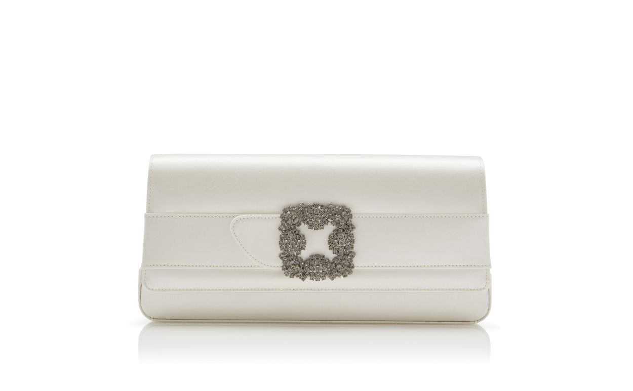 Light cream satin rectangular clutch bag featuring flap-over design and crystal buckle. Contains internal zipped compartment, mirror and removable chains with two length options. Magnetic closure. Outer: 68% viscose, 32% silk. Lining: 68% viscose, 32% silk. Made in Italy. Height: 12 cm Length: 24 cm Width: 3 cm. Straps measure 37 cm and 110 cm. Product ID: 9XX-0794-0042