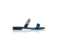 Navy blue satin open toe flat sandals featuring toe strap, crystal embellished instep strap and flat stacked heel. Upper:72% viscose, 28% silk.Sole:100% calf leather.Lining:100% kid leather.Heel measures:10 mm.Italian sizing. Made in Italy. Product ID: 325-3088-0002