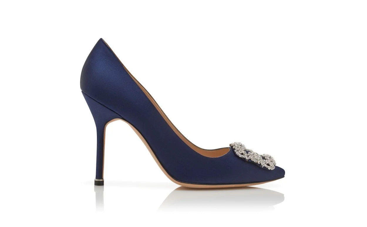 Navy blue satin almond toe pumps featuring a clear crystal buckle and stiletto high heel. Upper:68% viscose, 32% silk.Sole:100% cow leather.Lining:100% kid leather.Heel measures:105 mm.Italian sizing. Made in Italy. Product ID: 9XX-0318-0044