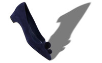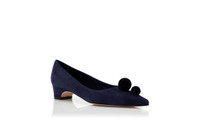 Navy blue suede pointed toe pumps featuring black suede pom pom detail and low block heel. Upper: 100% kid suede. Sole: 100% calf leather. Lining: 100% kid leather. Heel measures 30 mm. Italian sizing. Made in Italy. Product ID: 423-1636-0004