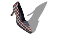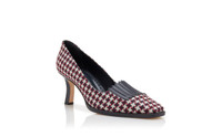 Navy blue wool pointed toe pumps featuring navy blue and red dogtooth design and nappa leather fringing details. Finished with flared mid heel. Upper: 90% wool, 10% lamb nappa. Sole: 100% calf leather. Lining: 100% kid leather. Heel measures 70 mm. Italian sizing. Made in Italy. Product ID: 225-1774-0001