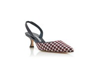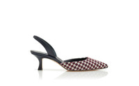 Navy blue wool pointed toe slingback pumps featuring red and black dogtooth design, elasticated slingback detail and stiletto low heel. Upper: 90% wool, 10% lamb nappa. Sole: 100% calf leather. Lining: 100% kid leather. Heel measures 50 mm. Italian sizing. Made in Italy. Product ID: 225-1778-0001