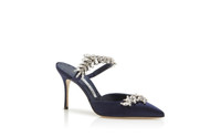 Navy satin mules featuring pointed toe, front strap with crystal embellishment and stiletto high heel. Upper: 68% viscose, 32% silk. Sole: 100% cow leather. Lining: 100% goat skin. Heel measures 90mm. Made in Italy. Product ID: 9XX-0362-0036