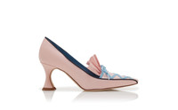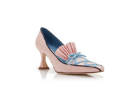 Pink silk almond toe pumps featuring a corset-style velvet ribbon criss-cross design, bow detail and decorative pleating. Finished with contrasting grosgrain piping and a flared block mid heel. Upper:90% silk, 10% velvet.Sole:100% calf leather.Lining:100% goat leather.Heel measures:70 mm.Italian sizing. Made in Italy. Product ID: 425-2210-0001