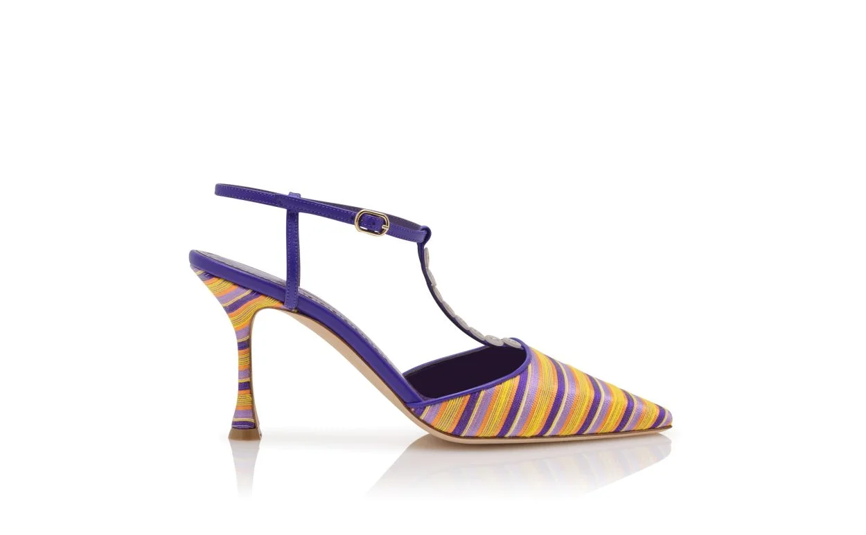 Purple and orange cotton almond toe slingback pumps featuring woven striped motif, nappa leather T-bar strap with handstitched button detailing and ankle strap closure. Finished with a flared high heel. Upper:90% fabric, 10% lamb nappa.Sole:100% calf leather.Lining:100% kid leather.Heel measures:90 mm.Italian sizing. Made in Italy. Product ID: 126-3026-0001
