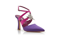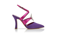 Purple satin pointed toe pumps featuring instep strap with crystal star embellishment, crossover ankle strap and angular high heel. Upper:72% viscose, 28% silk.Sole:100% calf leather.Lining:100% kid leather.Heel measures:105 mm.Italian sizing. Made in Italy. Product ID: 325-3106-0001