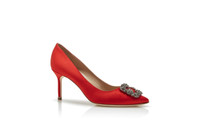 Red satin almond toe pumps featuring a square crystal buckle encased in a gunmetal frame. Finished with a stiletto mid heel. Upper: 68% viscose, 32% silk. Sole: 100% cow leather. Lining: 100% kid leather. Heel measures 70mm. Italian sizing. Made in Italy. Product ID: 9XX-0662-0033