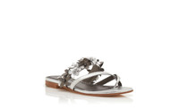 Silver nappa leather open toe flat sandals featuring crossover front straps with toe stem and instep strap with tonal decorative flowers. Finished with flat stacked heel. Upper: 100% lamb nappa. Sole: 100% calf leather. Lining: 100% kid leather. Heel measures 10 mm. Italian sizing. Made in Italy. Product ID: 225-1766-0001