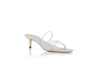 Silver nappa leather open toe mules featuring thin front strap detailing and stiletto low heel. Upper: 100% lamb nappa. Sole: 100% calf leather. Lining: 100% kid leather. Heel measures 50 mm. Italian sizing. Made in Italy. Product ID: 224-1685-0002